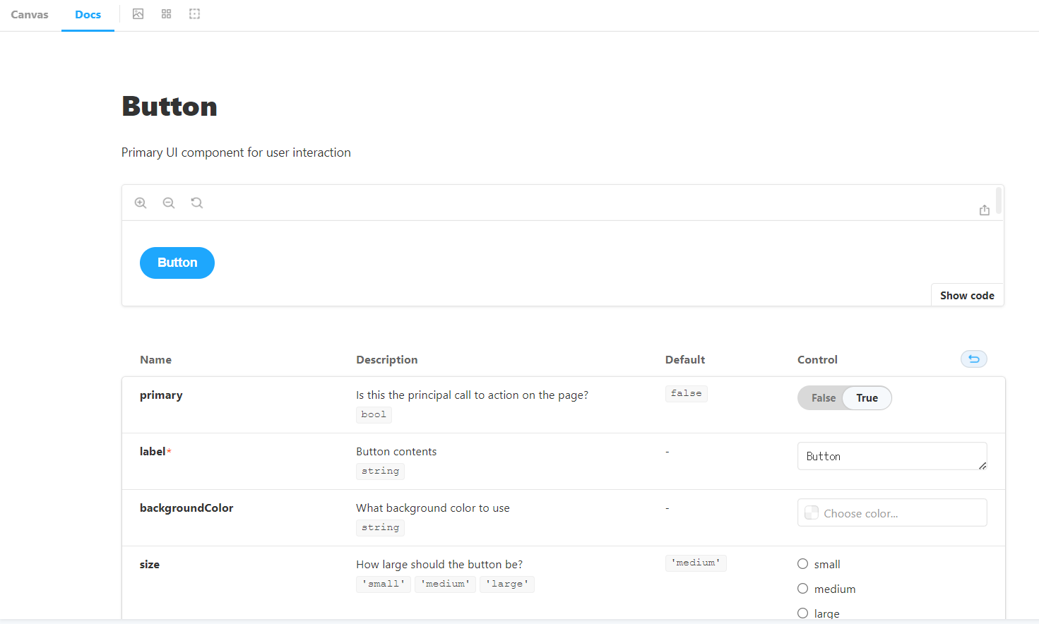 예를 들어 Button 컴포넌트에 있는 propTypes를 바탕으로 자동으로 Docs 페이지를 생성하는 것을 볼 수 있다.