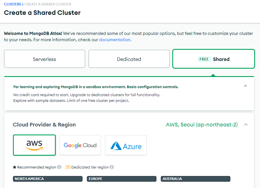 세 가지 옵션이 있는데, 사이드 프로젝트 용으로 사용할 것이므로 무료 버전인 Shared 를 선택해준다.