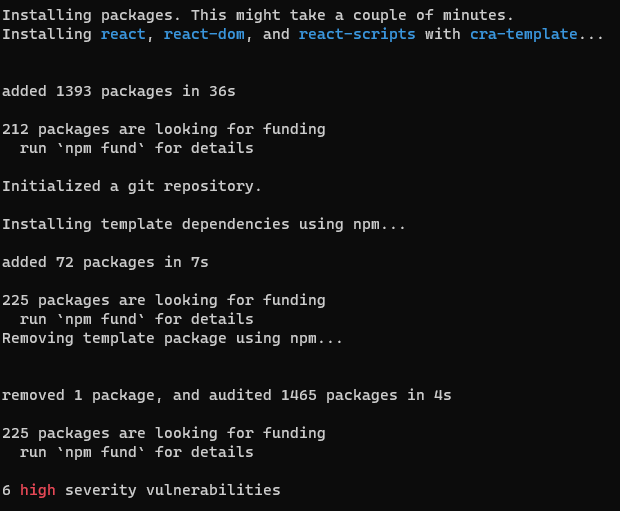 npx create-react-app my-app 으로 리액트를 생성한 결과 프로젝트 생성 + 패키지 설치까지 약 1분, dev 서버 시작까지 1분 8초가 걸렸다.