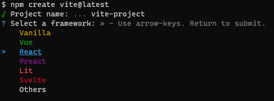 그런 다음 프로젝트 이름을 입력하고, 방향키를 사용해 React를 선택한 후 엔터키를 누른다.